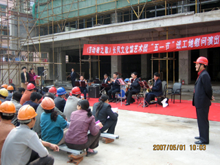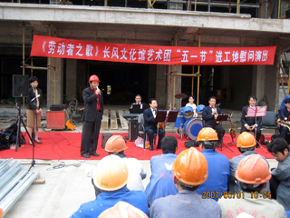 2007年“五一”國際勞動節(jié),長風文化館的樂隊來到北盛公司宜川社區(qū)學校工地進行慰問演出,史益敏總經(jīng)理代表北盛公司向長風文化館樂隊致以熱烈歡迎,并陪同堅持節(jié)日在工地建設的務工人員觀看演出。