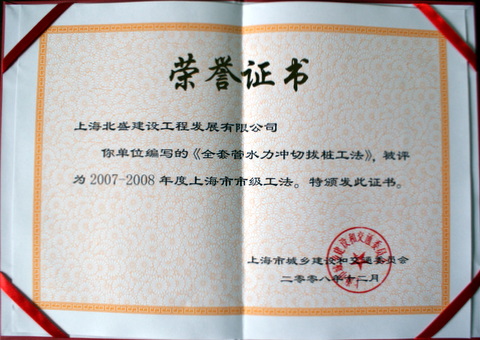在2009年1月6日上海市城鄉(xiāng)建設(shè)和交通委員會辦公室印發(fā)的滬建交[2008]1160號—上海市城鄉(xiāng)建設(shè)和交通委員會關(guān)于公布《2007-2008年度上海市級工程建設(shè)施工工法》的通知中,第二十一項(xiàng)為上海北盛建設(shè)工程發(fā)展有限公司申報的《全套管水力沖切拔樁工法》。由上海市建設(shè)和交通委員會科學(xué)技術(shù)委員會組織評審,編號為:技字2008-09-698-21號評審證書由上海建工(集團(tuán))總公司院士葉可明上海市建設(shè)交通委科技委教高工吳君侯等九位資深專家簽發(fā),評審意見認(rèn)為:該項(xiàng)技術(shù)經(jīng)過上海市有關(guān)單位的技術(shù)查新,未見相同內(nèi)容的國家級工法,具有新穎性,其成果達(dá)到國內(nèi)先進(jìn)水平。該技術(shù)是采用拔樁專用設(shè)備,固定在轉(zhuǎn)動鋼管內(nèi)的高壓水路,鋼管刀口砍斷樁外周和樁底端粘連的固結(jié)和摩擦力,拔樁套鋼管內(nèi)設(shè)置的彈性鋼板樁底托,以及大型吊車將待拔樁拔起,清樁時間快。該工法具有較好的經(jīng)濟(jì)和社會效益。工法內(nèi)容較齊全,工藝原理明確,表達(dá)較清楚,符合工法編寫要求。同意評為市級工程工法,并推薦申報國家級工程建設(shè)工法。