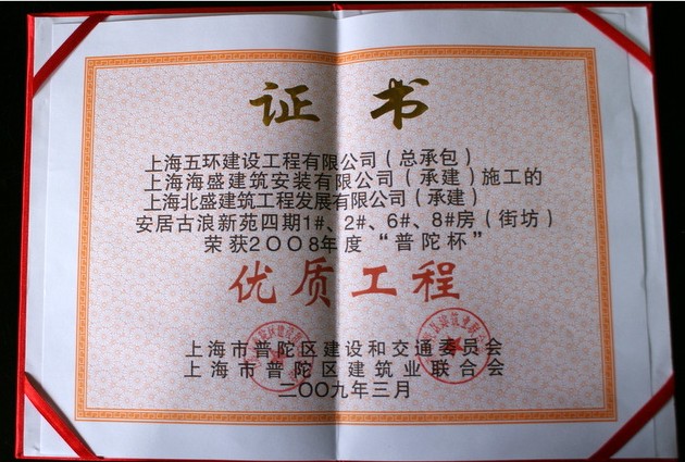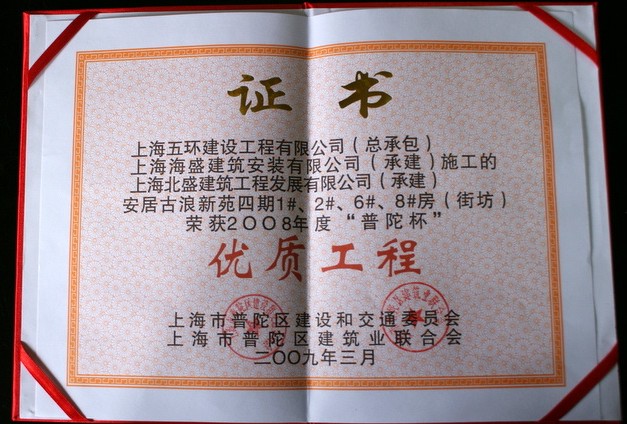 上海五環(huán)建設(shè)工程有限公司(總承包),北盛公司項目經(jīng)理宋宗勝率隊(承建)施工的安居古浪苑四期1#、2#6#8#房(街坊),于二000九年三月,榮獲上海市普陀區(qū)建設(shè)和交通委員會、上海市普陀區(qū)建筑業(yè)聯(lián)合會頒發(fā)的2008年度“普陀杯”優(yōu)質(zhì)工程獎杯和證書。