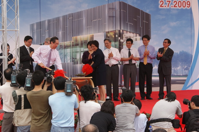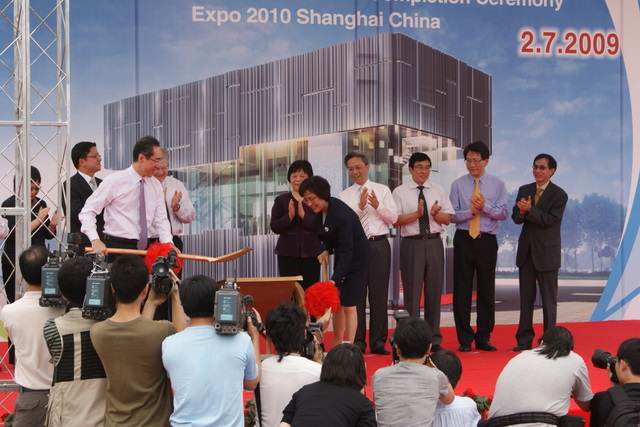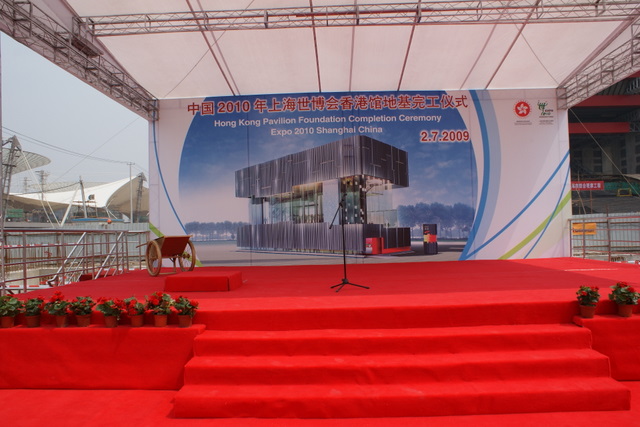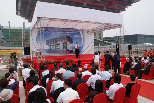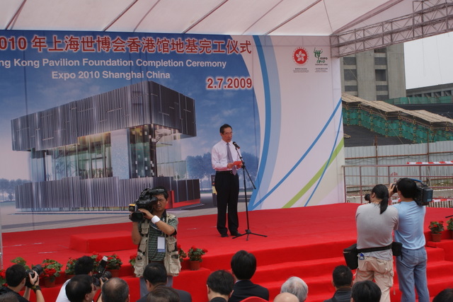 2009年7月2日上午11:38分,世博會香港館地基完工儀式在香港館工地舉行。香港政務(wù)司司長唐英年、上海世博會執(zhí)委會專職副主任鐘燕群出席儀式。