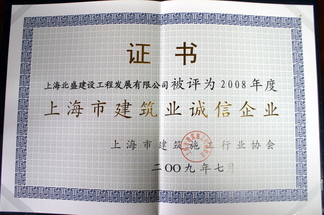 2009年7月30日,上海召開2008年度建筑企業(yè)綜合排名、上海建筑業(yè)誠信企業(yè)、上海市建筑工程白玉蘭獎頒獎大會。我公司被授予2008年度上海市建筑業(yè)誠信企業(yè)證書。
