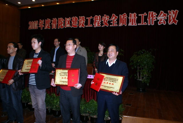 會(huì)議作了《穩(wěn)中求進(jìn) 求真務(wù)實(shí) 狠抓落實(shí)全面提升建設(shè)工程安全質(zhì)量管理水平》工作報(bào)告,宣讀了《關(guān)于表彰2011年度普陀區(qū)優(yōu)質(zhì)工程等獲獎(jiǎng)單位的決定》,并為獲獎(jiǎng)項(xiàng)目和單位代表頒獎(jiǎng);上海雅戈?duì)栔脴I(yè)有限公司和上海市第七建筑有限公司代表作了交流發(fā)言。