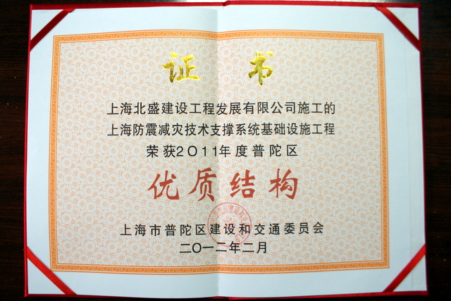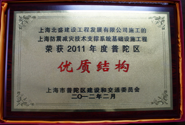 會(huì)上,北盛公司總承包的上海防震減災(zāi)技術(shù)支撐系統(tǒng)基礎(chǔ)設(shè)施工程榮獲2011年度普陀區(qū)優(yōu)質(zhì)結(jié)構(gòu)獎(jiǎng)。質(zhì)量安全部經(jīng)理谷從發(fā)代表公司上臺(tái)領(lǐng)獎(jiǎng)。