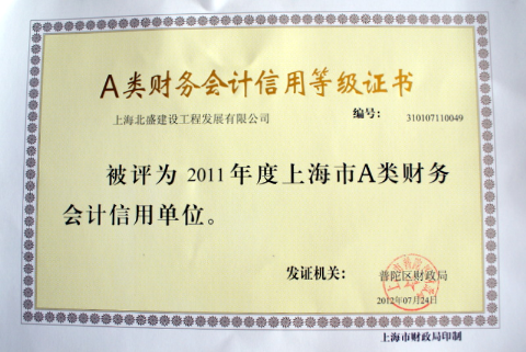 2011年度上海市A類財務(wù)會計信用單位等級證書