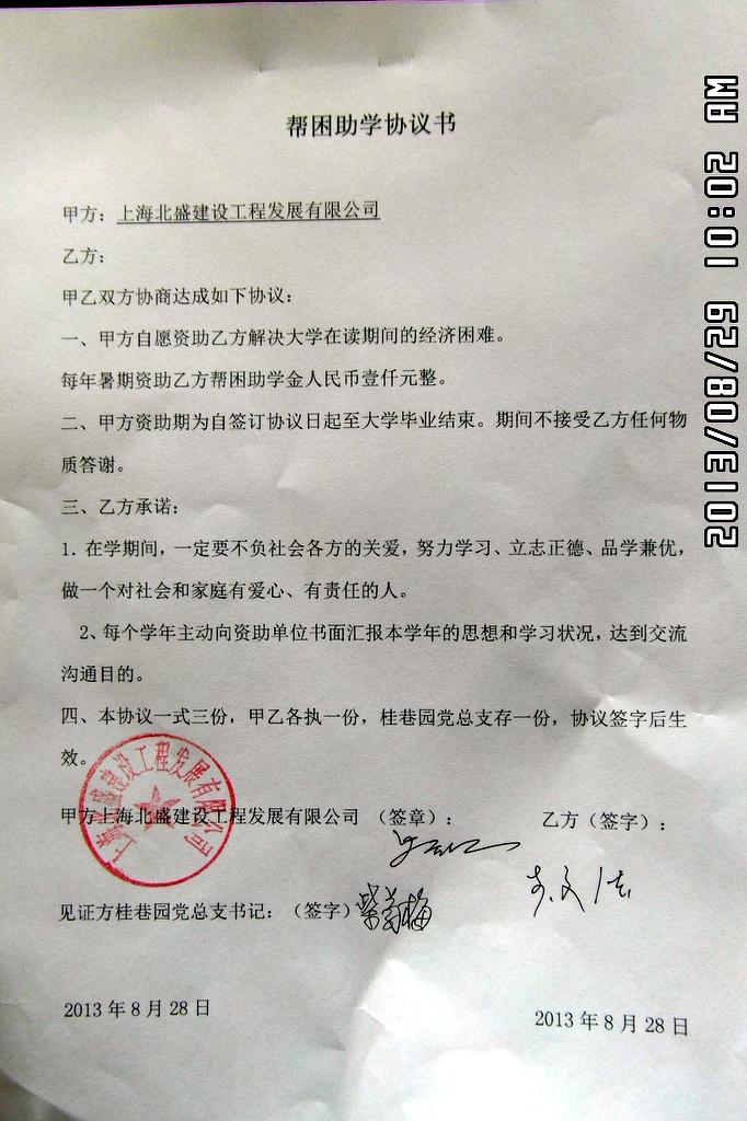 我是李玉婷,現(xiàn)讀于上海外國語大學(xué)賢達(dá)經(jīng)濟(jì)人文學(xué)院,是一名大三的旅游管理專業(yè)的學(xué)生,由于一直受上海北盛建設(shè)工程發(fā)展有限公司的支助,才能順利地完成我的大學(xué)生活,在此深表謝意,現(xiàn)在能做的也就是以優(yōu)異的成績報答社會。