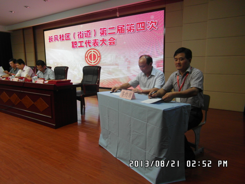 2013年8月21日,公司總經(jīng)理出席長風社區(qū)職代會,代表在長風社區(qū)(街道}注冊的企業(yè)業(yè)主方與長風總工會主席簽訂集體合同。