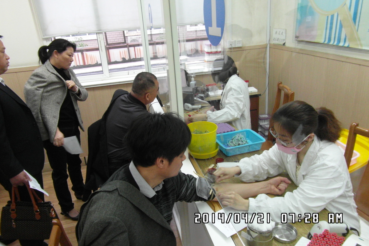 2014年4月21日,北盛公司近40位員工7:30前早早來到普陀區(qū)中心醫(yī)院體檢中心(花溪路505號(hào)或蘭溪路164號(hào)10號(hào)樓,參加健康檢查。除了常規(guī)項(xiàng)目外,全部增加的項(xiàng)目有:甲狀腺彩超,C12.另外安裝男女性別不同,分別加上前列腺彩超,乳腺彩超等婦科專項(xiàng)檢查。
