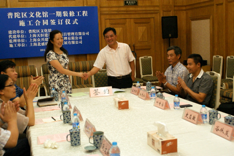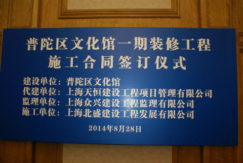 2014年8月28日10:30,普陀區(qū)文化館一期裝修工程施工合同簽訂儀式在普陀區(qū)文化館七樓舉行。出席簽訂儀式的有:建設(shè)方中共普陀區(qū)委宣傳部副部長普陀區(qū)文化局黨委書記桂正和,普陀區(qū)文化局局長何麗芬,普陀區(qū)文化局副局長范文翔,普陀區(qū)文化館黨支部書記楊定彪、館長陳小霞、副館長沈崎;施工方上海北盛建設(shè)工程發(fā)展有限公司董事長??偨?jīng)理史益敏,黨支部副書記兼工會主席葉世安、質(zhì)量安全部經(jīng)理谷從發(fā),裝修工程項(xiàng)目部負(fù)責(zé)人余未和。還有:上海恒天建設(shè)工程項(xiàng)目管理有限公司代表茅紹壯,上海眾興建設(shè)工程監(jiān)理有限公司工程監(jiān)理王佳偉。