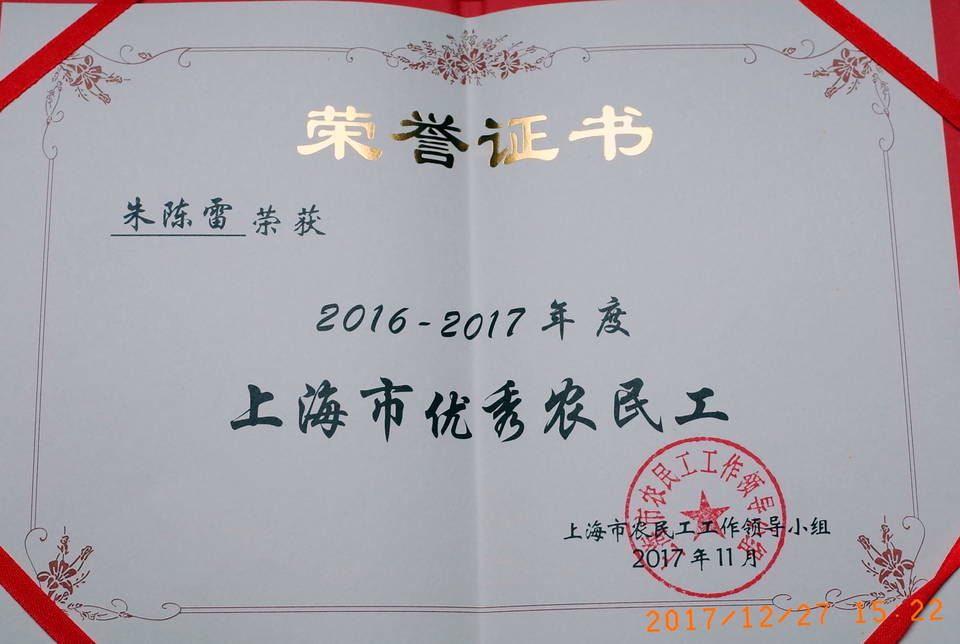 2016-2017年度上海市農(nóng)民工先進(jìn)個(gè)人。