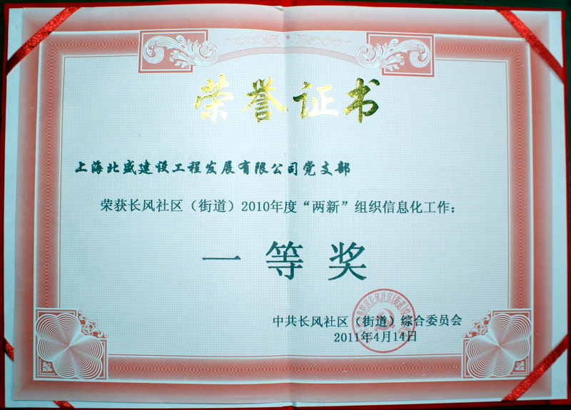 公司黨支部2005年8月榮獲區(qū)委組織部《2004~2005年度普陀區(qū)非公用企業(yè)“五好”黨組織》獎牌;2007年6月榮獲上海市委組織部社工委《上海新經(jīng)濟(jì)組織、新社會組織“五好”黨組織》獎牌;2010年12月榮獲區(qū)委《世博先鋒行動先進(jìn)基層黨組織》獎牌;2011年6月榮獲區(qū)委《先進(jìn)基層黨組織》獎牌。