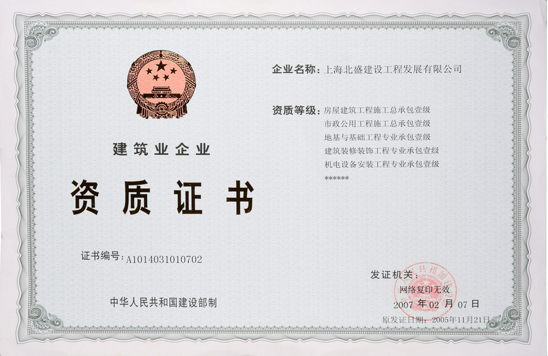 | 1 | 五項(xiàng)一級(jí)施工資質(zhì)證書 | 查看 |